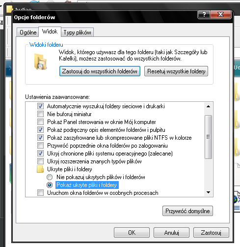 4. Przechodzimy w zakładkach na Widok, tam wyszukujemy opcję "Pokaż ukryte pliki foldery" i klikamy OK.