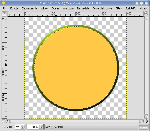 Lime Point 5. Nie usuwamy zaznaczenia. Tworzymy nową warstwę; nazywamy ją koło. Klikamy: Zaznaczenie -> Powiększ. Wpisujemy 2. Wybieramy Wypełnianie kolorem lub deseniem  Wypełnienie kubełkiem [Shift+B]. Kolor wybieramy, jaki nam pasuje. Oby współgrał z kolorystyką pierścienia (autor tutaj dał kolor zielony, który za bardzo z żółtym nie współgra - ale też bardzo się nie gryzą). W opcjach Wypełnienia kubełkiem zaznaczamy Całe zaznaczenie. Wypełniamy zaznaczenie kolorem na warstwie koło. Tak wszystko powinno wyglądać: