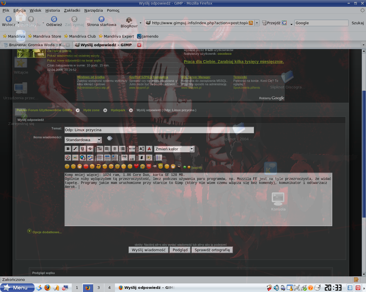 Ogólnie niby wyłączyłem tą przezroczystość, lecz podczas używania paru programów, np. Mozzila FF jest na tyle przezroczysta, że widać tapetę. Programy jakie mam uruchomione przy starcie to Gimp (który nie wiem czemu włącza się bez komendy), komunikator i odtwarzacz Amrok.