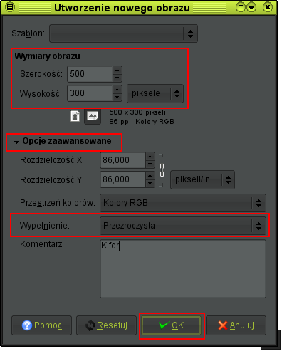 Lime Point 3.   W oknie dialogowym Tworzenie nowego obrazu w opcji Szerokość wpisz 500, a w opcji Wysokość wpisz 300.
