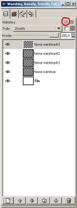 Co do okna warstw i znikających kanałów: kanały, ścieżki i historia obrazu są w tym okienku na osobnych zakładkach. Czasem zakładki znikają Mrugnięcie Żeby je odzyskać, klikasz w to, co Ci zaznaczyłam na czerwono: