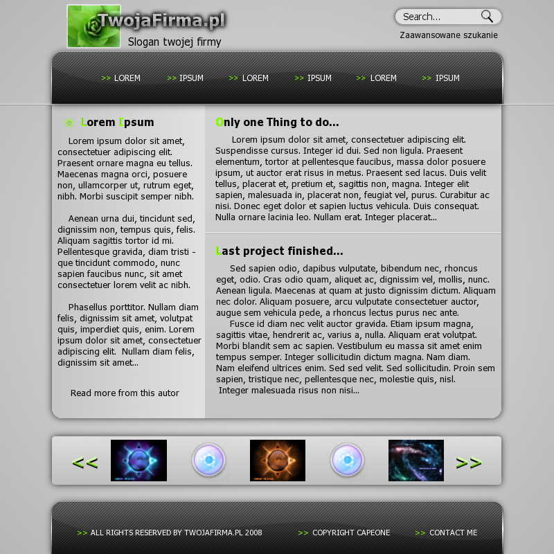 Zacznijmy może od tego, co widzi się na pierwszy rzut oka, czyli znacznie za duże menu i za duża stopka. Drugą rzeczą, jaka się rzuca patrząc na projekt jest niestarannie wykonane logo firmy.