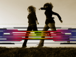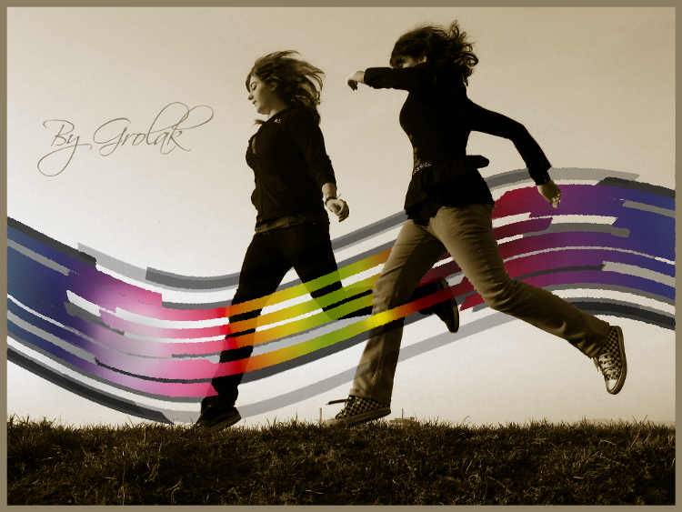 Lime Point 9. Otwieramy nasz plik ze smugą, wyłączamy Tło, łączymy widoczne warstwy [Ctrl+M] oraz wycinamy smugę. Wklejamy ją jako nową warstwę na naszym zdjęciu. Warstwa -> Przekształcenie -> Obróć o 90o w prawo. Jeżeli smuga jest za krótka (jej szerokość jest mniejsza od szerokości zdjęcia), to duplikujemy warstwę z nią i za pomocą narzędzia Odbicie Odbicie [Shift+F] odbijamy ją w poziomie. Teraz dopasowujemy do niższej warstwy ze smugą i łączymy je. Przemieszczamy naszą smugę w pobliże miejsca w której będzie "przechodzić". W moim przypadku są to nogi tych pań. W ten sposób powstała taka smuga: