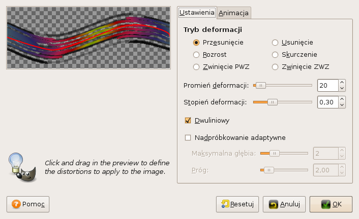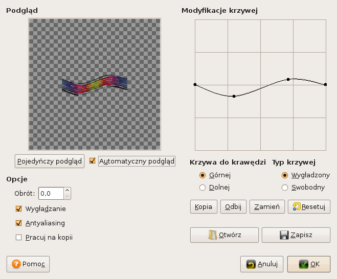 Niestety filtr Wyginanie krzywych bardzo psuje jakość obrazka powodując, że "smuga" ma brzydko postrzępione krawędzie. Ładną, gładką falę można uzyskać wyginając obraz za pomocą pluginu G'MIC i filtra: Testing -> Zonderr -> Mathmap flag: