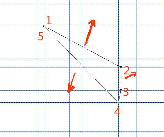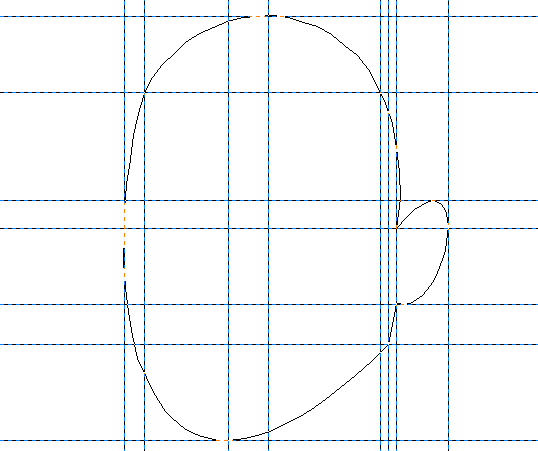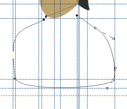 Lime Point 2. Narzędziem Ścieżki Ścieżki [ B ] klikamy w te same punkty co na rysunku. Są one na przecięciu się prowadnic. Warto wybrać Widok -> Powiększenie -> 400%, ułatwi nam to pracę. Kiedy ustawimy wszystkie punkty możemy odznaczyć Widok -> Przyciągaj do prowadnic (możemy też je ukryć w tym samym menu). Następnie przekształć je tak jak pokazuje rysunek: