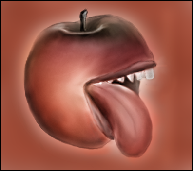 HasiuK: szkoda, że na odwał, część jabłka koło ogonka jest ładnie oddana. Całości brakuje soczystej barwy. Znajdź sobie jabłko live na wzór i powinno wyjść. Usta niestety wyszły nienaturalnie. I wskazówka: nie używaj smużenia, airbrusha i miękkich pędzli jak najmniej i unikaj czystej bieli do zaznaczania refleksów Uśmiech