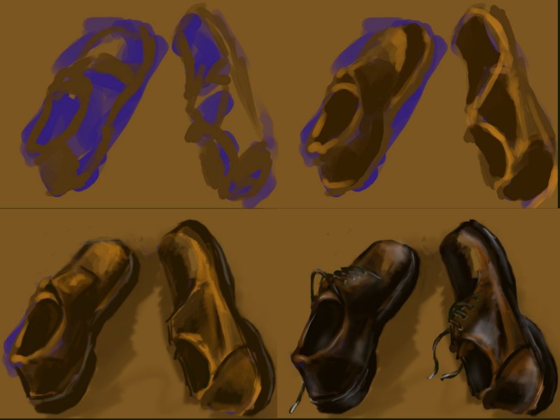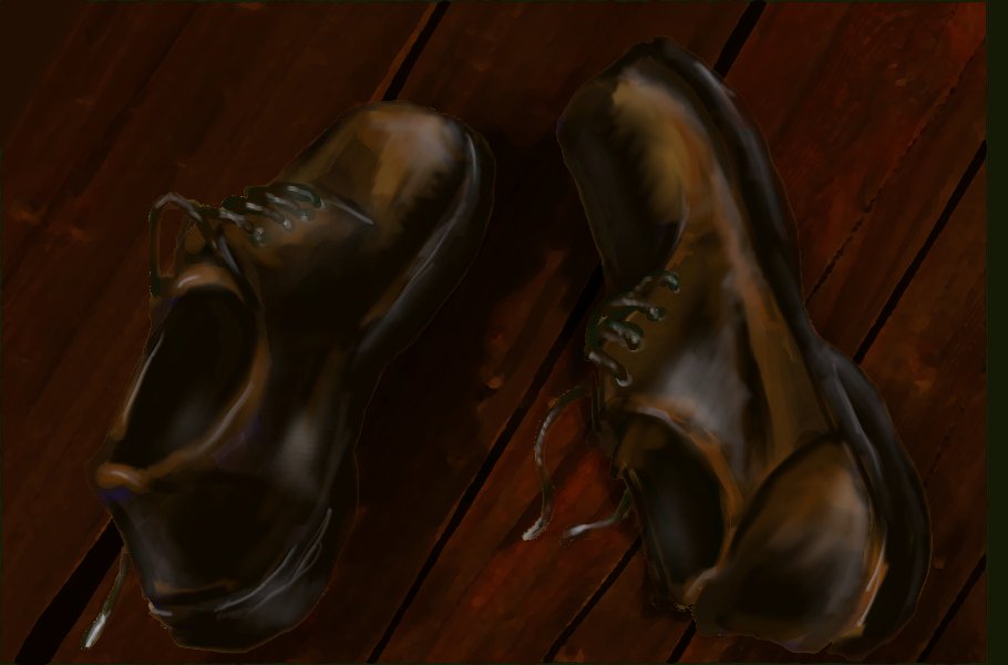 problem w tym że po 5 minutach zaszło słońce i zrobiło się totalnie ciemno wiec jakoś tak na zgaduj zgadula malowałem ....  bo widać było tylko "bliki" na powierzchni ... ostatnie  20 minut to było z pamięci bo nie było widać butów Język (ciemno brązowe buty na ciemno brązowej drewnianej podłodze ......  w ciemnym pokoju .... (ta to było sprytne)