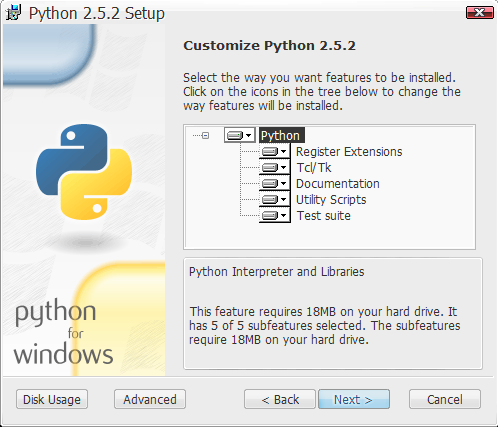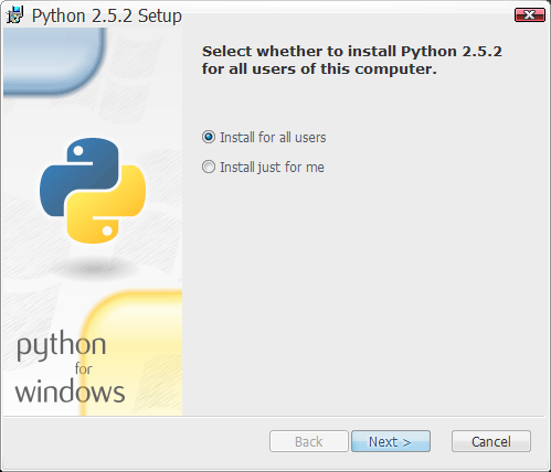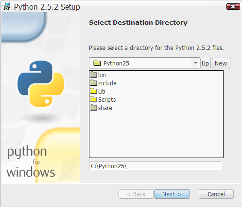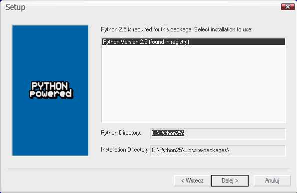 Na drugim ekranie wybieramy wersję Pythona do jakiej ma bibliotek zostać doinstalowana. Z założenia jest tylko jedna, więc nie powinno tu być za wiele do wyboru - zamieszczony powyżej link pozwolił na zainstalowanie Pythona w wersji 2.5.1. Taki też jest widoczny na obrazku powyżej.