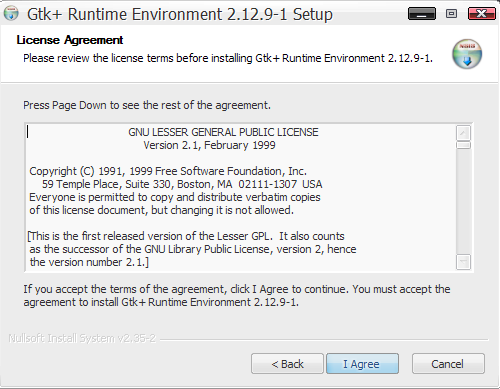 Instalacja GTK+ zaczyna się od zaakceptowania licencji (GNU Lesser General Public License) - po przez kliknięcie na przycisk "I Agree".