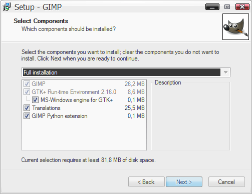Po kliknięciu "Next" ukaże sie nam ekran wyboru składników do zainstalowania, upewniamy się, że "GIMP Python Extension" jest wybrane.