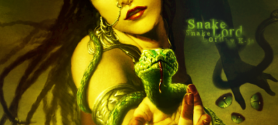 Snake Lord - przydałoby się jakieś wtopienie Uśmiech Kobietę mogłaś trochę rozmyć, ale leciutko, a na węża dać więcej światła tak żeby przyciągał wzrok. Napis, nie najlepszy, nie pasuje mi jakoś do tej sygnatury, i za duży ten mały napis Snake Lord by K-ja. Przyciemnij prawą stronę, dodaj jakieś źródło światła, a w tło daj może jakieś delikatne C4D.