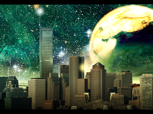 w fotomanimpulacji przesadziłeś z ostrością nieba, szczególnie gwiazd. reszta jak najbardziej ok, moze jeszcze te rozmycie popraw u dołu tego "wybuchu" czy co to tam jest Uśmiech