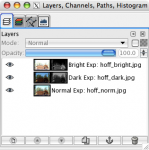 Po wybraniu naszych zdjec i zaakceptowaniu ustawien domyslnych (mozna je zmienic) w oknie dialogowym (ctrl+L) pokaza sie nam trzy warstwy i dwie maski: