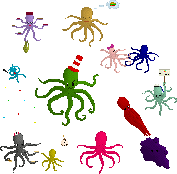 Można się nieco przyczepić do kolorów, resztę ci na PW napisałam. Czyli: różowa zrobiona tak, że nie widać zbytnio konturów ani cieniowania. To samo z czerwoną. Plus zbyt ostry kolor kapelusza na zielonej ośmiornicy. Nie używaj #FF0000 tylko jakiś ciemniejszy i mniej nasycony odcień. Poza tym nie jest pocieniowany, a jeśli jest to za słabo. Przez ilość tych ośmiorniczek psuje się wrażenie. Po tej fali narzekań Mrugnięcie składam propozycję: mogłabyś zrobić taką z założonymi mackami. Oczywiście nie tylko, dodaj jakieś elementy. Albo animowaną, ale to już poważniejsze wyzwanie.