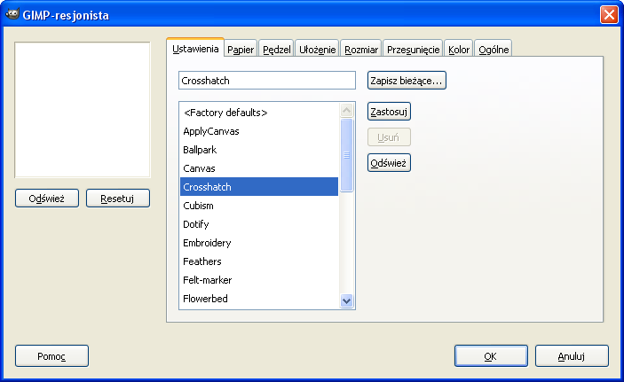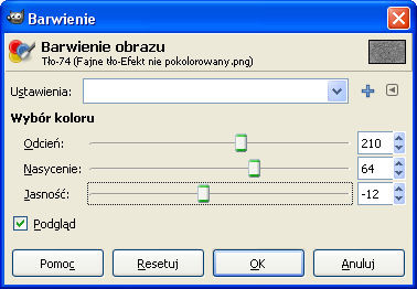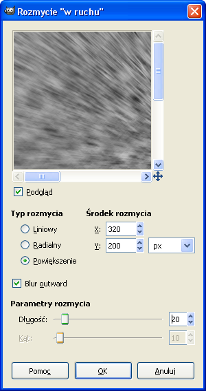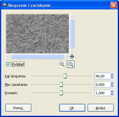 Zaczynamy 1. Tworzymy nowy obraz [Ctrl+N] o dowolnych wymiarach (u mnie 640x 400px) 2. Następnie robimy: Filtry -> Artystyczne -> GIMPresjonista... z ustawieniami poniżej i powtarzamy tą czynność dwa razy (2 razy [Ctrl+F]). 3. Teraz stosujemy filtr Rozmycie "w ruchu" ( Filtry -> Rozmycie -> Rozmycie "w ruchu"...) o wartościach podanych poniżej. Powinno nam wyjść coś takiego: 4. Duplikujemy warstwę [Shift+Ctrl+D] (wyjdzie nam prawdopodobnie warstwa kopia:Tło). Włączamy aktywność warstwy Tło i na niej robimy: Filtry -> Zniekształcenia -> Skręcanie i zaciskanie... z takimi ustawieniami: 5. Teraz włączamy aktywność kopii warstwy ( kopia:Tło) i stosujemy ten sam filtr. Kąt skręcenia zmieniamy na -120,00 i klikamy OK. 6. Zmieniamy tryb krycia górnej warstwy na: Tylko ciemniejsze i łączymy je ( Warstwa -> Połącz w dół). 7. Tło gotowe, tylko szare jest nieładne, więc robimy: Kolory -> Barwienie.... Wybieramy dowolne ustawienia (nie przesadzajcie z nasyceniem). U mnie są takie: Koniec