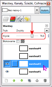 Krycie warstw zmieniasz za pomocą suwaka w oknie warstw (Okna -> Dokowane okna dialogowe -> Warstwy). Od 100 (warstwa nieprzezroczysta) do 0 (całkowita przezroczystość). Im mniejszą wartość ustawisz tym większą przezroczystość uzyskasz. Oczywiście krycie możesz zmieniać tylko na aktywnej warstwie. Musisz więc najpierw kliknąć w okienku na wybraną warstwę. Aby mieć podgląd warstwa musi być widoczna co symbolizuje ikona oka. Warstwy powyżej tej wybranej powinny być niewidoczne.