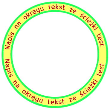 Otóż mam znak graficzny, który wygląda tak, że są dwa koncentryczne okręgi (środkowy okręg wypełniony jest różną grafiką).  Pomiędzy owymi dwoma okręgami chciałbym umieścić DWA napisy, jeden na górze, drugi na dole (oczywiście każdy z nich musiałby mieć mniej niż 180 stopni, żeby się nie zlewały).  Tak więc nie ma to być jeden napis po kółku (360 stopni), tylko dwa napisy.  Wiem, że można zrobić coś takiego jak tekst na ścieżkę, ale po pierwsze najpierw należałoby stowrzyć ścieżkę (a właściwie dwie, jedną na górze, a drugą na dole), która byłaby idealnym wycinkiem idealnego okręgu o promieniu dokładnie takim, by napis zmieścił się dokładnie w środku pomiędzy moimi dwoma okręgami - a nie mam bladego pojęcia jak to osiągnąć - a po drugie trzeba by później dokonać odpowiedniego przekształcenia tego tekstu na te ścieżki, a też nie wiem jak to zrobić.