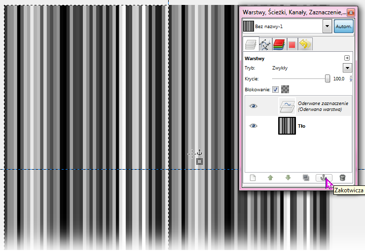 Lime Point 5.Na środku powstaje pasek szerszy od pozostałych. Aby go zlikwidować, a także by paski nie były tak symetryczne, wybieramy zaznaczenie prostokątne Zaznaczenie prostokątne i zaznaczamy całą lewą połowę obrazu (korzystając z pionowej prowadnicy) oraz klikamy: Zaznaczenie -> Oderwij. Następnie: Warstwa -> Przekształcenie -> Odbij poziomo i zakotwiczamy oderwaną warstwę klikając na symbol kotwicy w oknie warstw