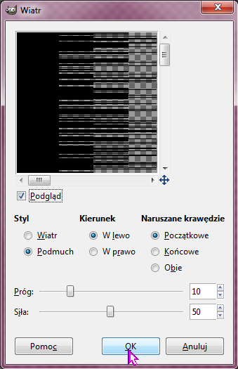 Lime Point 9. Wybieramy: Filtry -> Zniekształcenia -> Wiatr, z ustawieniami: Podmuch; W lewo; Początkowe; Próg: 10, Siła: 50