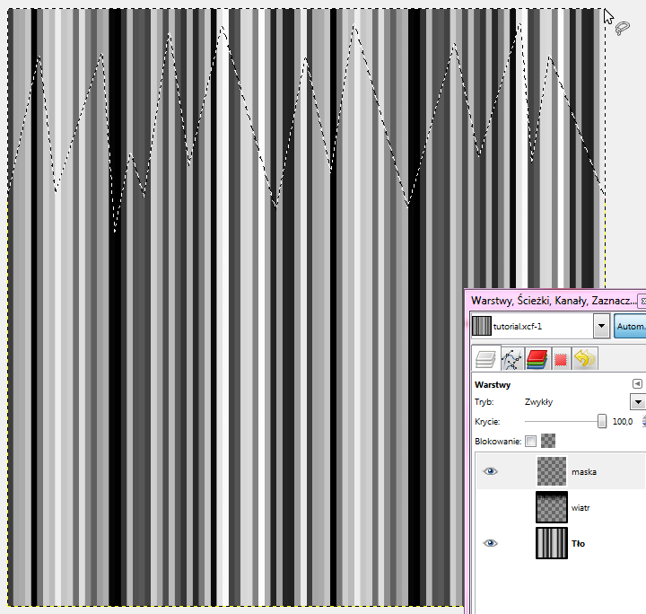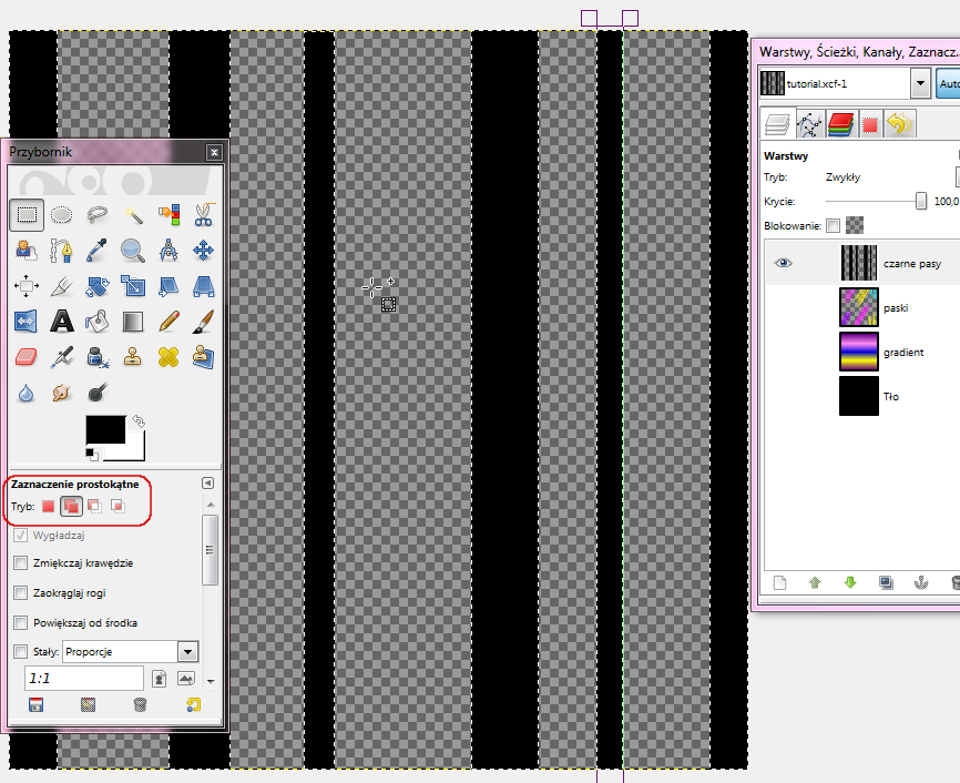 Lime Point 39. Wyłączamy widoczność pozostałych warstw i wybieramy zaznaczenie prostokątne z trybem ustawionym na dodawanie. Na warstwie czarne pasy tworzymy kilka pionowych zaznaczeń o szerokości ok. 40 - 80px i na całą wysokość obrazu. Zaznaczenie wypełniamy kolorem czarnym i wyłączamy