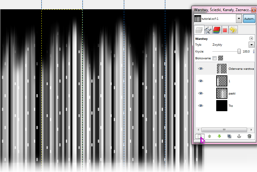 Lime Point 24. Uaktywniamy warstwę paski. Zaznaczamy część warstwy od lewej krawędzi do pierwszej prowadnicy i odrywamy zaznaczenie, po czym klikamy na ikonę czystej kartki, aby oderwane zaznaczenie zmienić na nową warstwę. Warstwę tę nazywamy 1
