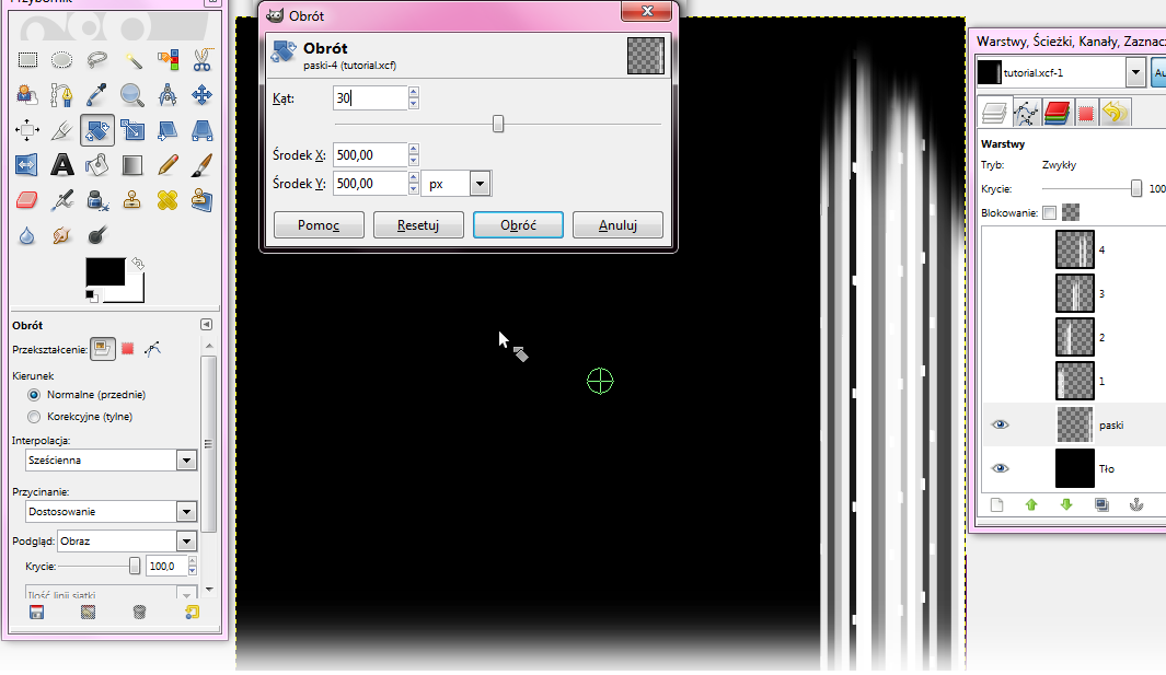 Lime Point 27. Przechodzimy na warstwę paski. Wybieramy narzędzie obrót Narzędzie do obracania, klikamy na warstwę i wpisujemy kąt 30o, resztę zostawiamy domyślnie i klikamy: Obróć