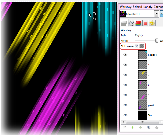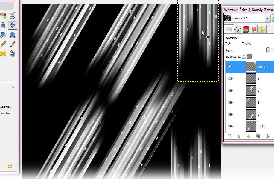 - Czynności powtarzamy, nazywając warstwy kolejnymi numerami, aż na warstwie paski zostanie ostatnia część, pomiędzy czwartą prowadnicą a prawą krawędzią obrazu. Po tej operacji powinno być w sumie 6 warstw, licząc od najniższej: tło, paski, 1,2,3 i 4