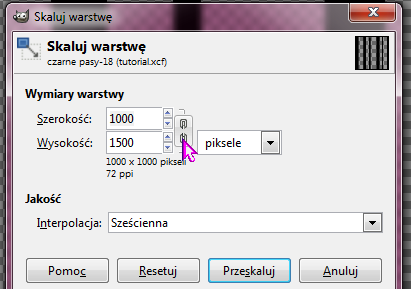 Lime Point 40. Skalujemy warstwę czarne pasy (Warstwa -> Skaluj warstwę)) zwiększając tylko wysokość (szerokość pozostawiamy bez zmian) do 1500px i obracamy ją o kąt -30o (czyli w stronę przeciwną do tej, w którą obracaliśmy kolorowe paski)