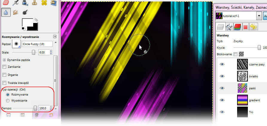 Lime Point 44. Przechodzimy na warstwę paski, dopasowujemy jej wymiary do obrazu (Warstwa -> Dopasuj wymiary warstwy do obrazu) i wybieramy narzędzie rozmywanie Rozmycie-wyostrzenie. Tempo rozmywania ustawiamy na 100. Skalę pędzla zmieniamy na 6 i rozmywamy ostre brzegi pasków (kanał alfa musi być odblokowany!)