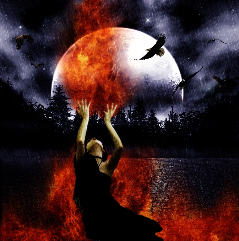 Dalej postaci... No tutaj już kiepsko. Niby dobrze wycięte (choć nie widać za dobrze i tak), ale jednak wyglądają tak na odwal. Wilki jakby wklejone na pokrywaniu, a kobieta kolorystycznie nie pasuje. Poza tym światło, różni się na postaciach i nie współgra z jego źródłem (księżycem). No chyba, że z przodu coś jeszcze świeci, ale to mało prawdopodobne, nie? (;