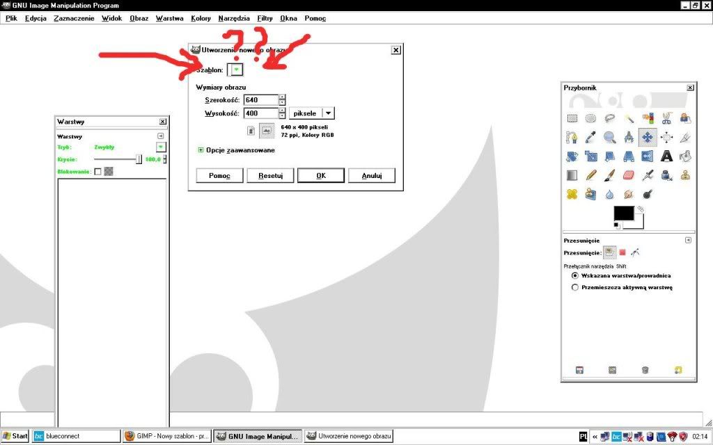 To było coś takiego. Tam gdzie wskazuje strzałeczką powinno być okienko z nowymi szablonami np A4, A3 itp. Okienko było ale nieaktywne.