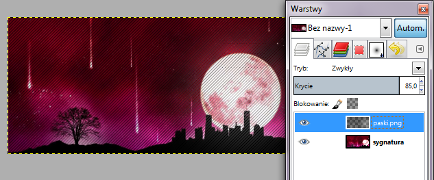 W razie potrzeby można nieco zmniejszyć krycie warstwy z paskami lub lekko wygumować niektóre fragmenty gumką z miękkim pędzlem. Można także zablokować przezroczystość w oknie warstw i fragmenty pasków przemalować miękkim pędzlem na dowolny kolor albo przeciągnąć po nich gradientem.