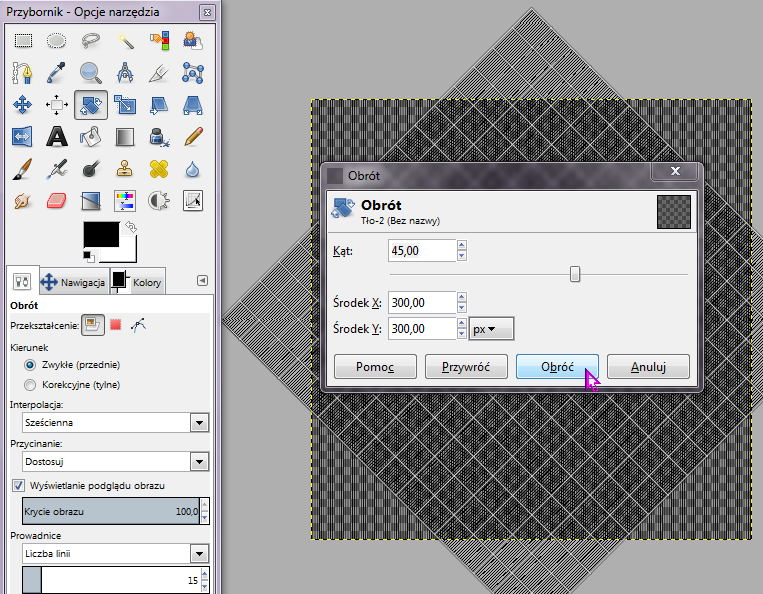 Lime Point 4. Po utworzeniu pasków wybieramy narzędzie Obrót Narzędzie do obracania i obracamy warstwę tak, aby uzyskać ukośne paski: