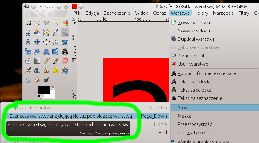 Obecnie używam GIMP-a 2.8.2, ale posiadam też wersję 2.6.12 kompilowaną ze źródeł. Zauważyłem, że funkcja zaznaczania wyższej warstwy w stosie zamiast nazwy ma komentarz. Najlepiej zobrazuje to rysunek:
