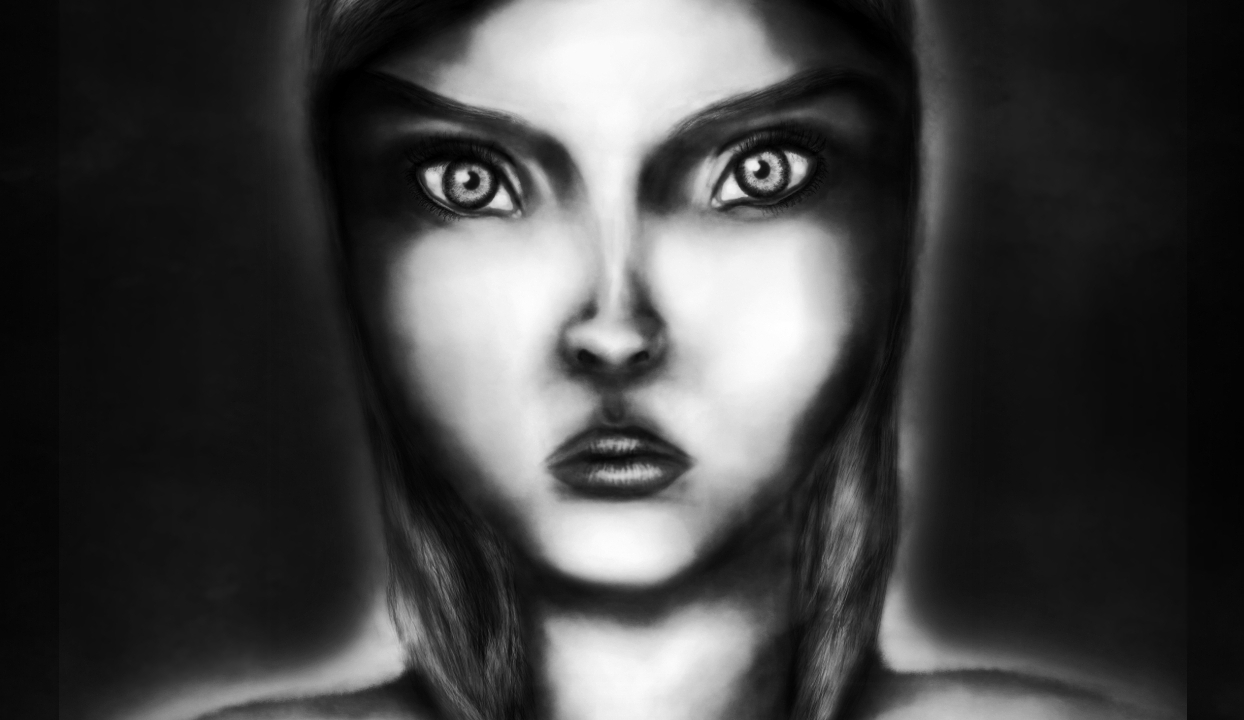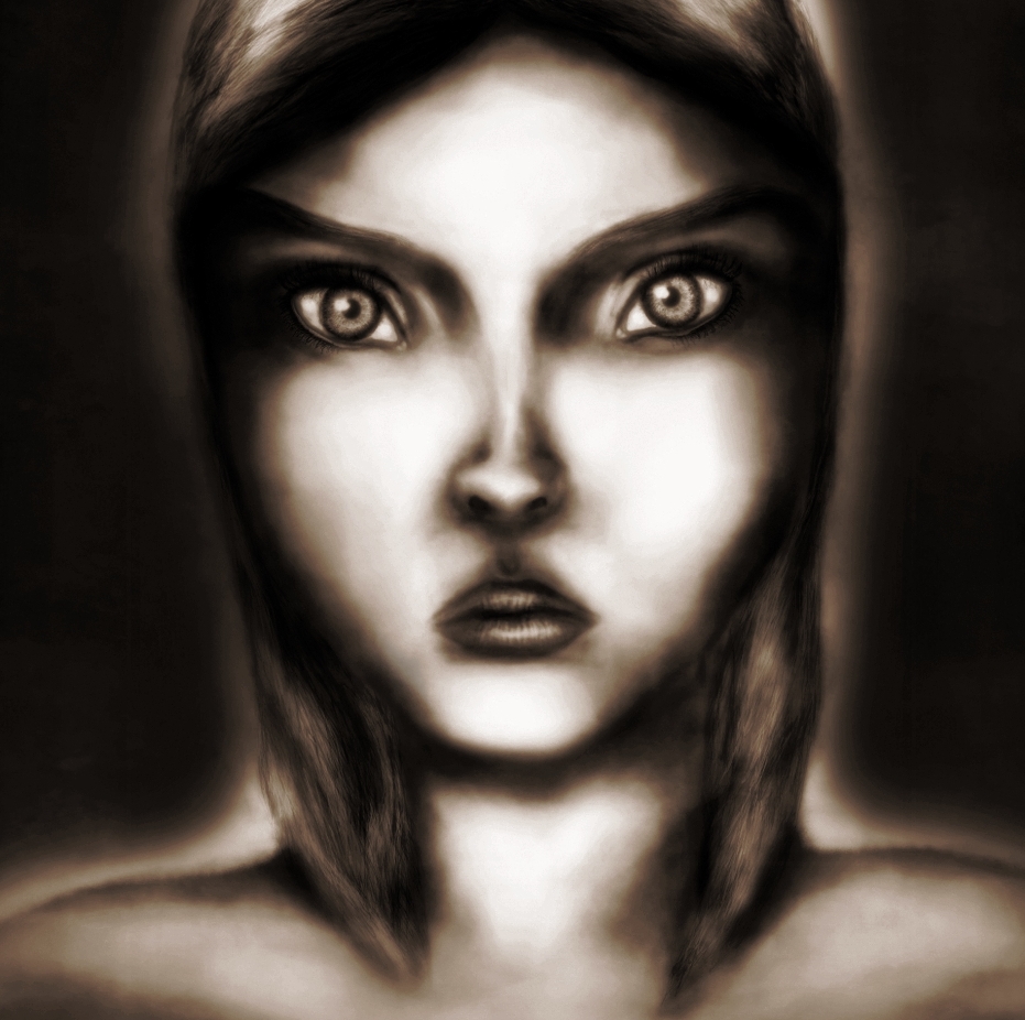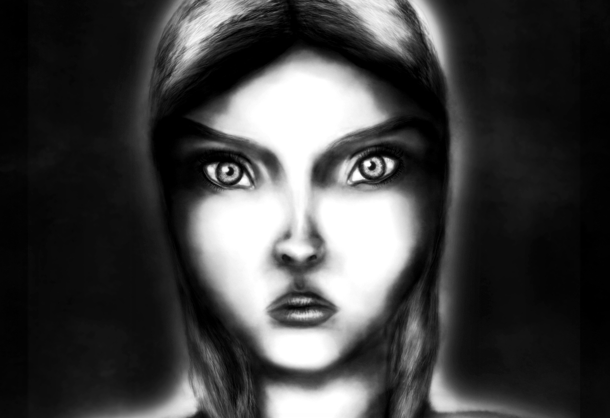 Co do niej. Ma fajny klimat. I jak na pierwsze próby w digitalu technicznie nie jest najgorzej. Anatomia jednak kuleje. Za płaska twarz, za cienki i słabo wymodelowany nos, ramiona są za sztywne, powinny lekko opadać. Za lekko zacieniona szyja pcha się na pierwszy plan. Zabrakło też tego wyraźnego dołka, który tworzą kości obojczyka stykające się z mostkiem przy jej nasadzie. A gdzie są uszy? Ma za mało włosów na bokach aby zostały nimi przykryte. Pilnuj też aby było równo względem osi postaci i perspektywy w której się znajduje, bo tu są lekkie krzywizny takie jak szyja czy włosy, uciekające gdzieś w bok. Natomiast oczy, które są najlepsze w całej twarzy są aż nadto symetryczne, za podobne do siebie. Jednak wyszły całkiem ładnie.