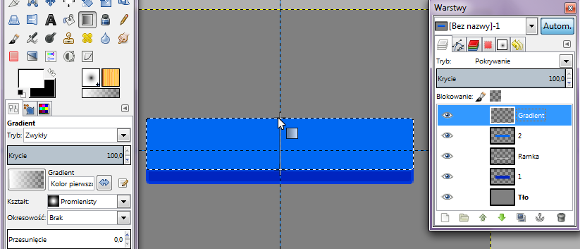 gradientem promienistym: kolor biały na przezroczystość. Gradient trzeba przeciągnąć idealnie w poziomie przytrzymując klawisz CTRL, dokładnie od środka do prawej krawędzi zaznaczenia