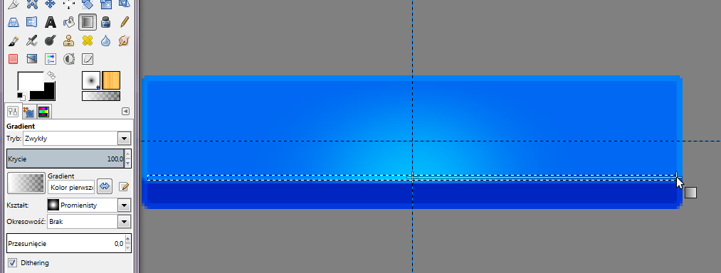 Kolor pierwszoplanowy na przezroczystość, Kształt: Promienisty i przeciągamy nim pionowo dokładnie od środka dolnej, do górnej krawędzi zaznaczenia