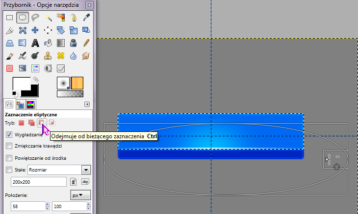 Tryb odejmowania i zaznaczamy dolną połowę zaznaczonego wcześniej obszaru w sposób pokazany na zrzucie