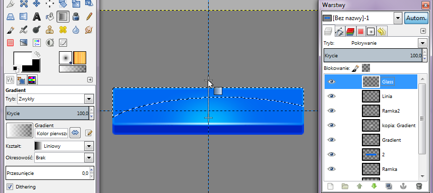 gradientem liniowym: kolor biały na przezroczystość, przeciągając go pionowo od dolnej krawędzi zaznaczenia nieco poza jego górną granicę. Tryb warstwy zmieniamy na