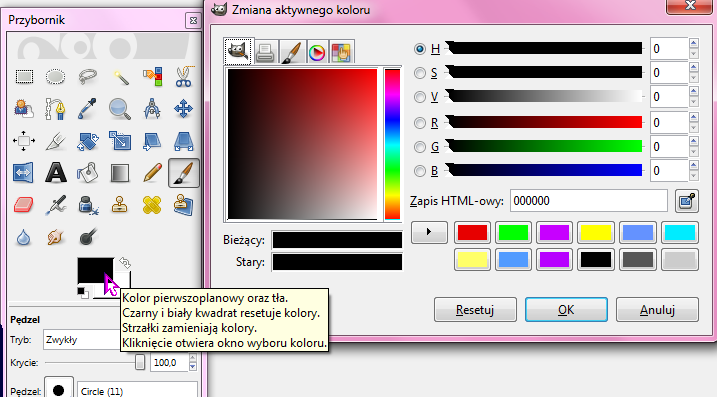 Wystarczy kliknąć w kolor pierwszoplanowy w przyborniku i wtedy otworzy się okno wyboru kolorów, gdzie można wkleić kod. W tym konkretnym przypadku wystarczy zduplikować warstwę z obrazkiem, na oryginalnej (tej poniżej) zablokować przezroczystość w oknie warstw i wypełnić wybranym kolorem. Natomiast na kopii zamieniasz brązowy kolor w przezroczystość (http://www.gimpuj.info/index.php/topic,64188.0.html). W ten sposób pozostanie Ci tylko ten biały połysk.