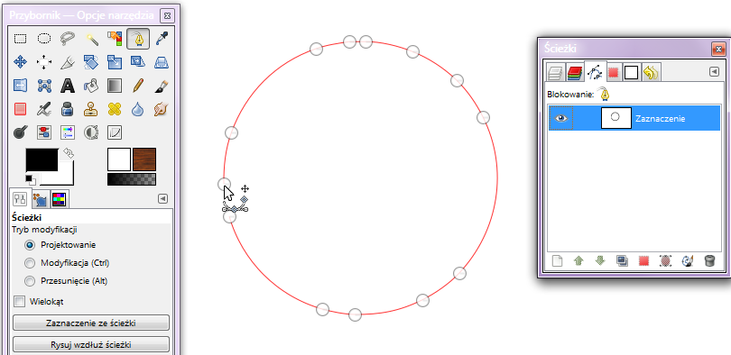 Jak już masz ścieżkę, to sprawdź na zakładce ścieżki. ( Ten tutorial o ścieżkach naprawdę nie gryzie. Mógłbyś go przeczytać- byłoby ci łatwiej)  Na tej paletce z warstwami 3 zakładka to zakładka ścieżek, jak tam klikniesz, To widzisz, czy masz ścieżki i jakie. I teraz uważaj zanim zaczniesz pracować ze ścieżką musisz mieć ja zaznaczoną tzn klikasz i podświetla się nazwa wybranej ścieżki. Wtedy GIMP wie na jakiej ścieżce ma pracować-rozumiesz?