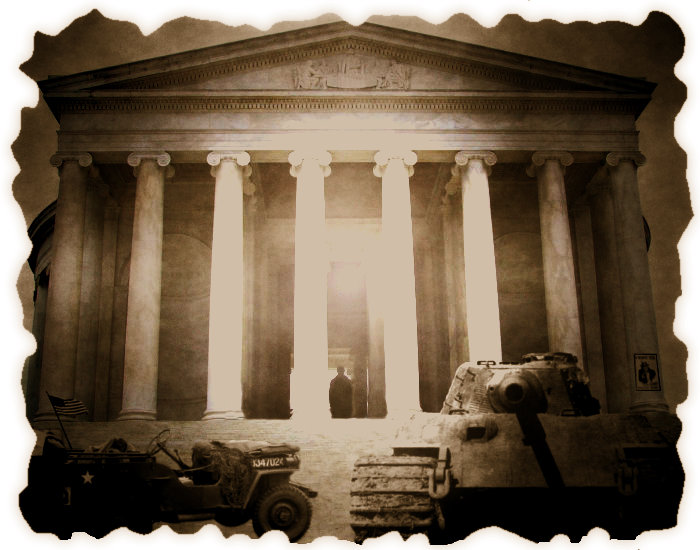 Nie lubię zbytnio tłumaczyć się z tego co stworzyłem, ale ta praca komentarza wymaga. Zamieszczone flagi NIE MAJĄ na celu propagowanie idei nazistowskich, znajdują się tam jedynie w celu ujednoznacznienia czasu i miejsca. Zresztą na drugim planie żołnierze rozrywają flagę, ale może to się w oczy aż tak nie rzucać.