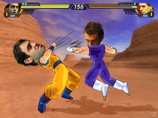 Bitwa Ronnie'go O'sullivana (po lewej) oraz Marka Selby'ego (po prawej) obrazuje finał turnieju Welsh Open. Dla niewtajemniczonych: w meczu do dziewięciu wygranych frejmów (gier) było 8-5 dla Ronnie'go. O dziwo, gdy wszyscy zaczęli opłakiwać tego drugiego, Mark, niczym feniks z popiołów, znalazł w sobie to coś - powrócił małymi kroczkami do meczu i wygrał go 9-8. Prosta foto manipulacja - największy (jedyny) problem polegał na wycięciu głów i wstawieniu ich w odpowiednie miejsca. Tło pochodzi z gry Dragon Ball.