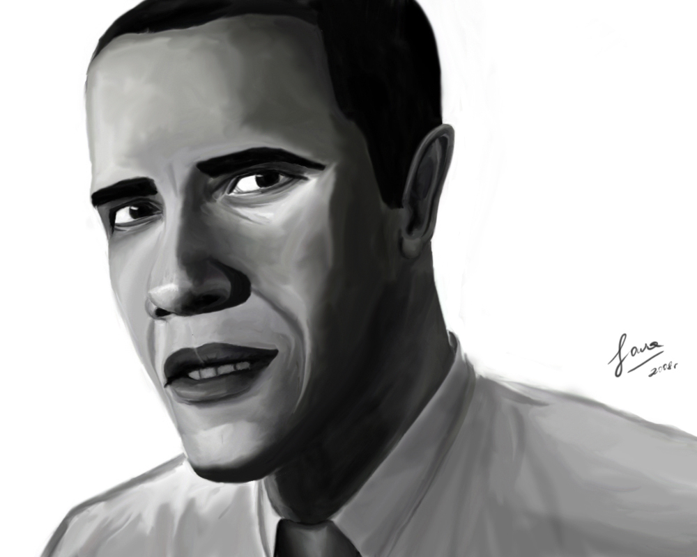 Wydaje mi się, że poprawiłeś ucho, ale nie jestem pewna. Nadal nie wygląda dobrze, jest za wąskie i zbyt "wyciągnięte" do góry. Nos powinien mieć bardziej opływowy kształt. Poza tym całkiem fajnie, mina naturalna, no i widać, że to Obama, a przynajmniej jego bardzo bliski krewny  Ładne cieniowanie, chociaż uzyskałeś dziwny efekt, jakby szkła czy chromu. Może gdybyś robił delikatniejsze i płynniejsze przejścia między cieniami, skóra wyglądałaby bardziej prawdziwie, matowo. Dziwne wrażenie sprawiają też brwi i oczy - niezbyt pasują do tego prawie naturalnego cieniowania, za to jakby robią z p. Obamy bohatera amerykańskiej kreskówki  Całość mi się podoba, ale myślę, że powinieneś się zdecydować: albo styl komiksowy (wtedy prostszy i ostrzejszy światłocień), albo realistyczny (wtedy poprawić brwi i wycieniować oczy).