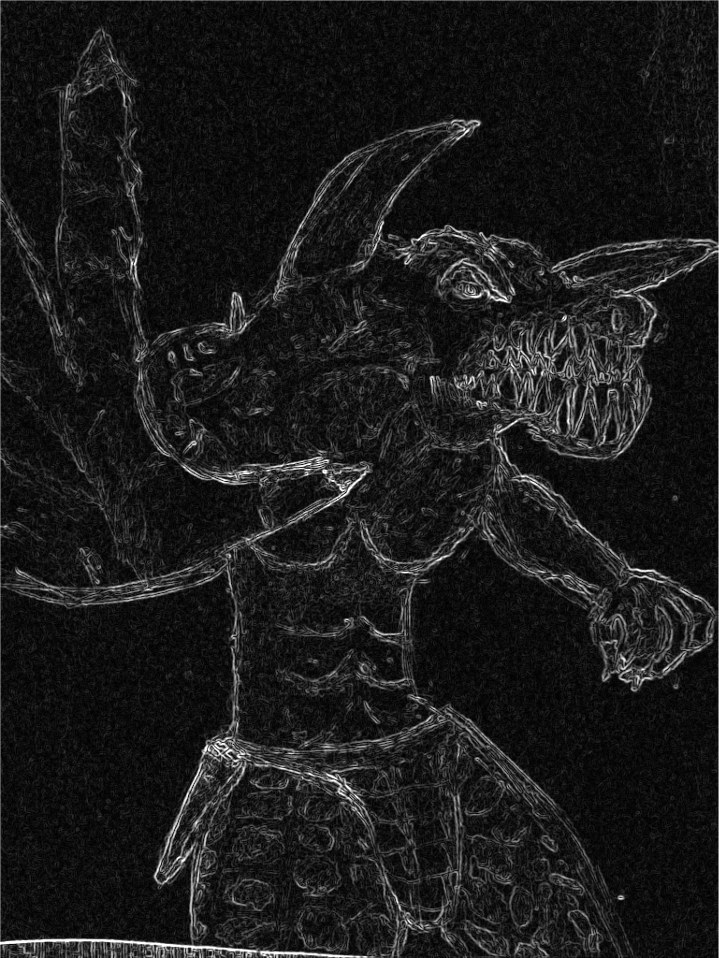 Moj rysunek. Najpierw wykonane na kartce, nastepnie wrzucilem i edytowalem w gimpie (wykrywanie krawedzi). wzorowalem sie na postaci z gry Unreal Tournament 3