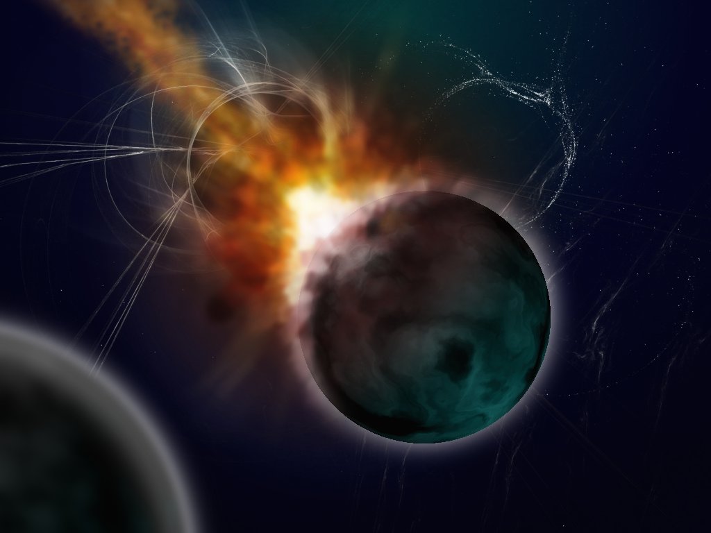 jest to praca zrobiona od podstaw w gimpie już wcześniej jednak dziś została przeze mnie dopieszczona. chciałem uzyskać efekt spadającej asteroidy uderzającej w planetę. mam nadzieję że mi wyszło co o tym sądzicie | Statystyki obrazu:
