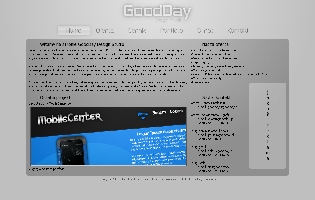 Lorem ipsum to specjalny tekst do wypełniania layoutów itp. Jest on po łacinie, ale to zlepek przypadkowych słów. Możesz go wygenerować na wielu stronach, np.: lorem-ipsum.pl. Więcej możesz przeczytać na Wikipedii: http://pl.wikipedia.org/wiki/Lorem_ipsumOstatnio edytowane pzez: davlasq 17.06.2010, 17:48:18