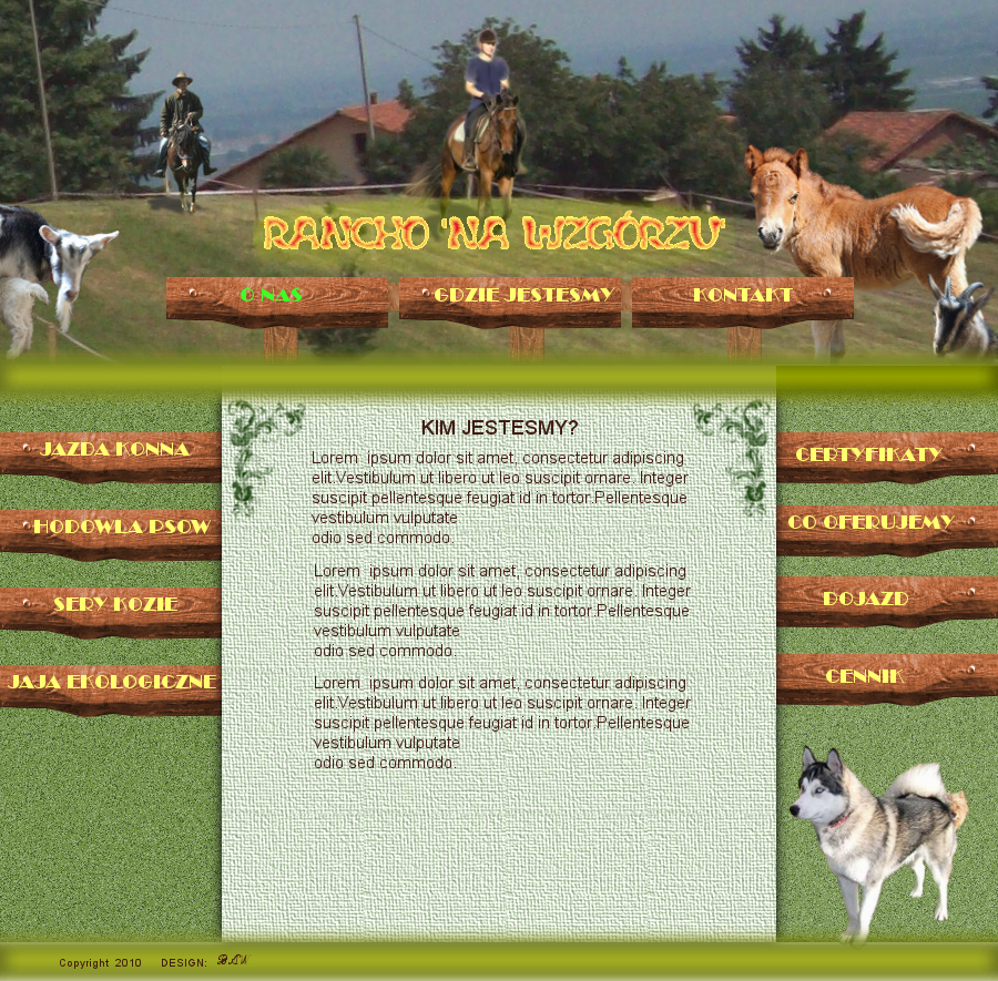Jest to wstępny projekt strony WWW dla gospodarstwa agroturystycznego prowadzonego przez moich znajomych. Zdjęcia pochodzą częściowo z mojej prywatnej kolekcji, część z grafiki Google. Te z Google zostaną wymienione na prywatne. | Statystyki obrazu: