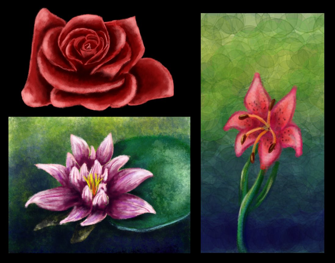 ciągle mam problemy z tabletem...i w dodatku ręka potwornie boli przy rysowaniu :> Zatem...trzeba ćwiczyć! A żeby było trochę śmieszniej, to każde z ćwiczeń zostało wykonane jednym tylko rodzajem pędzla. Chronologicznie wygląda to następująco - lilia, lilia wodna i róża. | Statystyki obrazu: