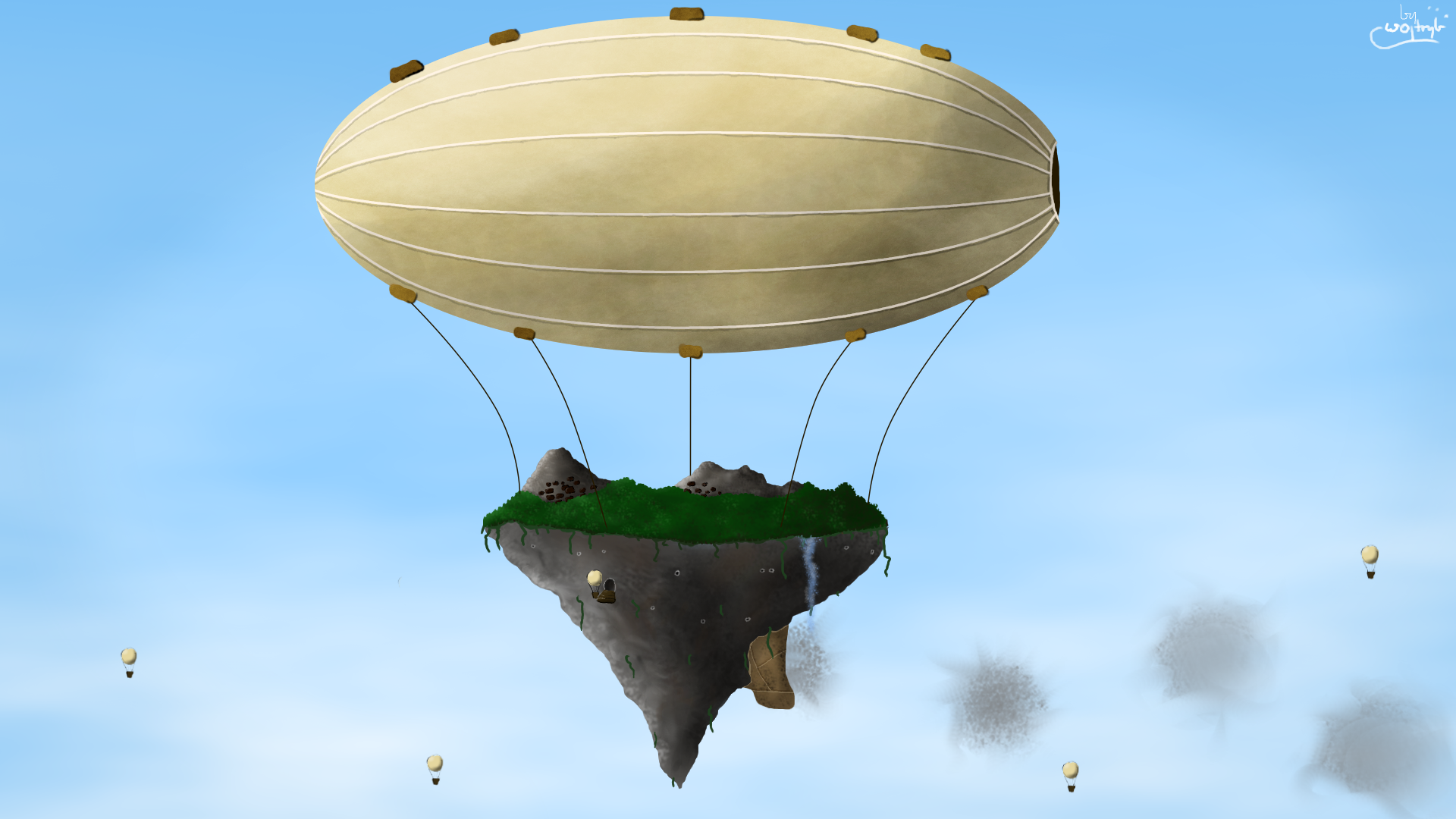 Co do chmur to się nie zgadzam. Niebo przecież czasem jest niebieściutkie wręcz jednolicie, choć obłoczki pewnie jakoś zapełniłyby pustą przestrzeń. Nie ogarniam tych brązowych klocków na czaszy. Po co takie wielkie i po co te na górze? Fajny port dla balonów, ale myślę, że nieco odważniej mógłbyś podejść do cieniowania, coby sterowiec wyłaził z ekranu.  Chciałbym choć tak malować w GIMP-ie...
